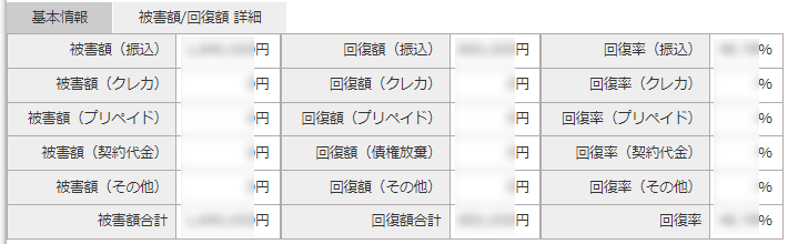 支払い方法別の被害額/回復額/回復率を確認できる。