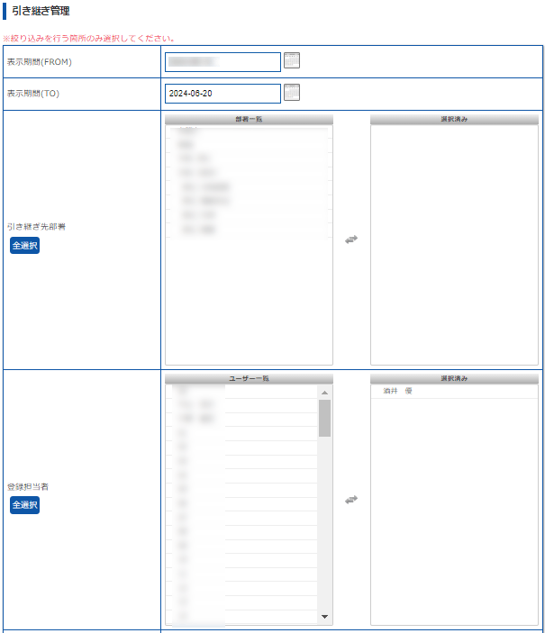 表示する引き継ぎ登録担当者を選択する。選択すると右の「選択済み」に移動する。