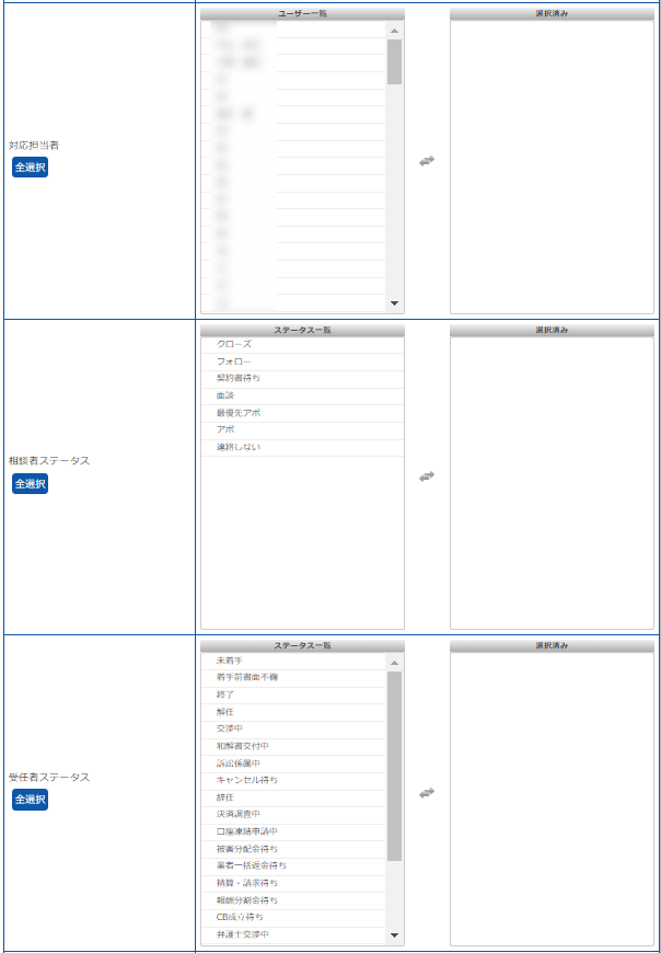 表示したい受任者ステータスを選択する。選択すると右の「選択済み」に移動する。