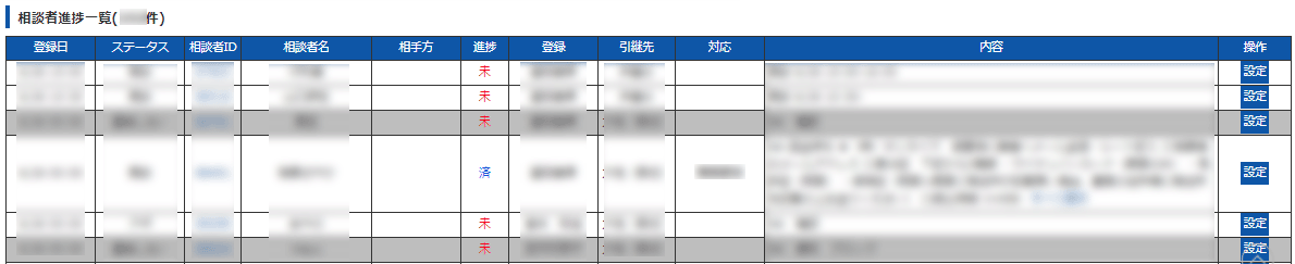 青い「設定」ボタンを押すと相談者進捗対応登録内容の編集を行う事ができる。