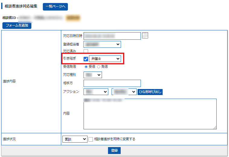 | 進捗一覧を表示して引継ぎ設定を行う | (引き継ぎに☑にした項目を含め)相談者進捗対応登録された全ての項目が表示される。 |