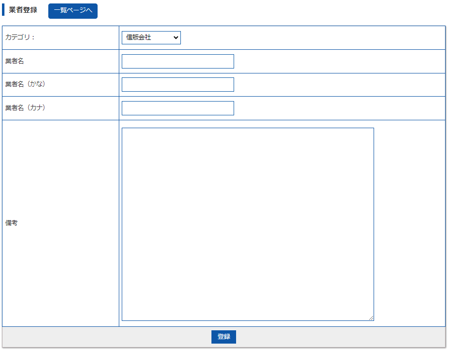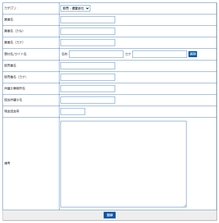 業者をシステムに登録できる。 カテゴリは、信販会社/決済代行会社/販売・運営会社/弁護士事務所/その他となっているのでプルダウンから選択する。 「販売・運営会社」を選択した場合は、入力項目が自動で変更される。