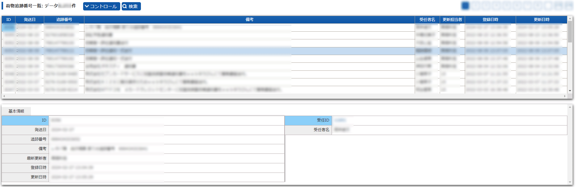 一覧の中から対象の荷物追跡番号情報を選択した状態(選択されているとID部分が水色になる)で、各動作を行う。