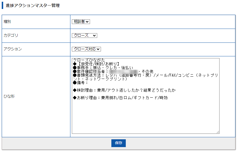 相談者/受任者の対応進捗の内容部分に「アクション」によって自動的に挿入されるひな形を編集できる。