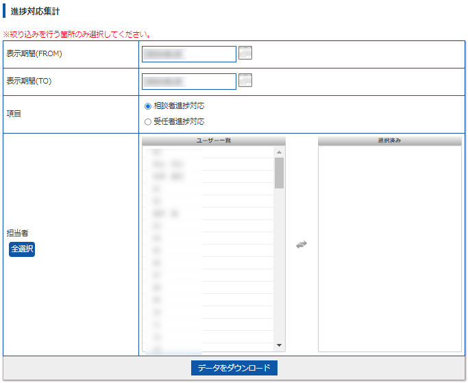 集計の対象にする担当者を選択する。選択すると右の「選択済み」に移動する。
