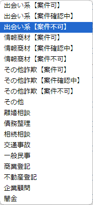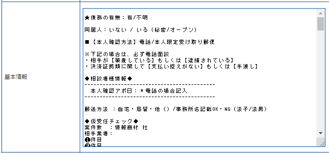 選択した相談種別に基づいて『相談者備考マスター管理』で設定したひな形が自動で入力される。